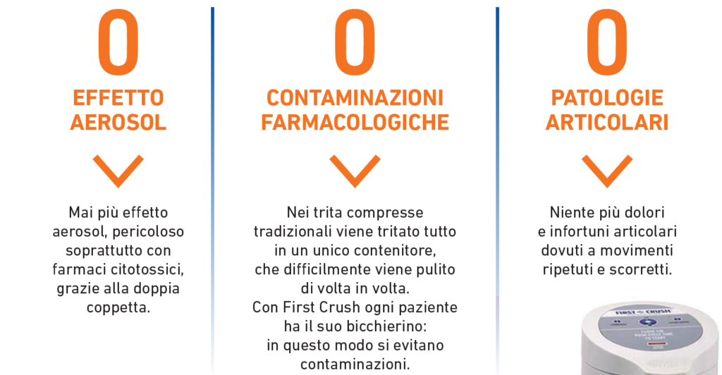 Grazie al doppio bicchierino First Crush è l'unico prodotto che risponde perfettamente all’ultima Raccomandazione Ministeriale n° 19 riguardo alle procedure di manipolazione del farmaco: